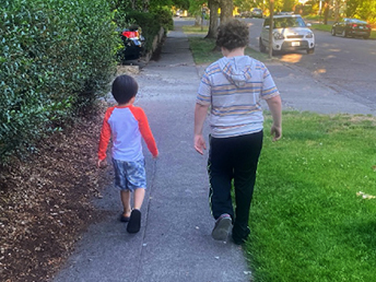 Two boys walking along a residential street in Eugene, Oregon, photograph by Kenneth Helphand.